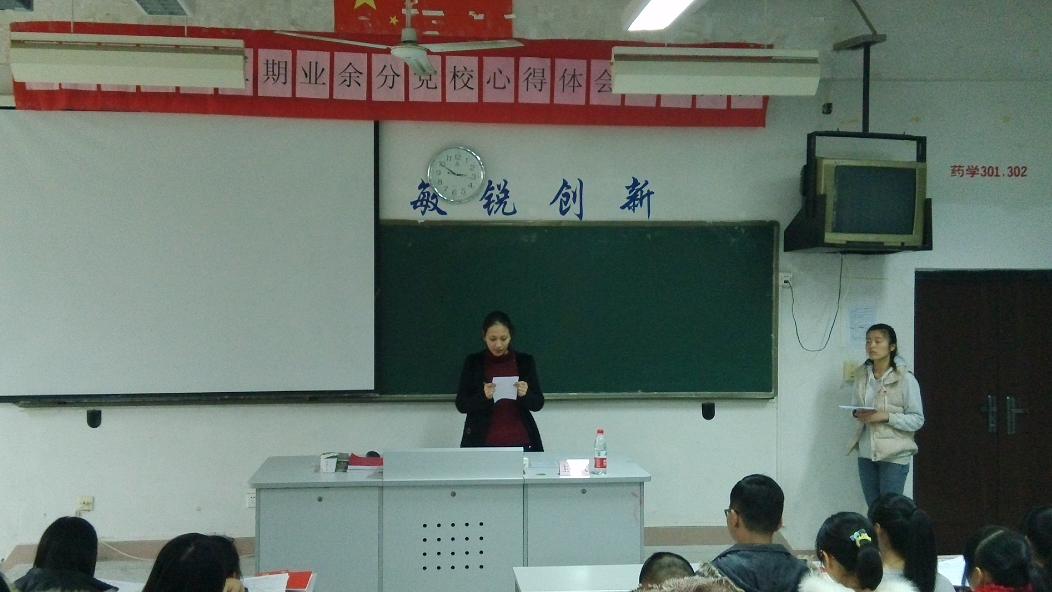 藥學(xué)系第十三期業(yè)余分黨校心得交流大會(huì)于12月10日下午在藥一階召開了。出席本次大會(huì)的老師有藥學(xué)系團(tuán)總支書記陳潔老師,輔導(dǎo)員胡丹老師,李寶珠老師。