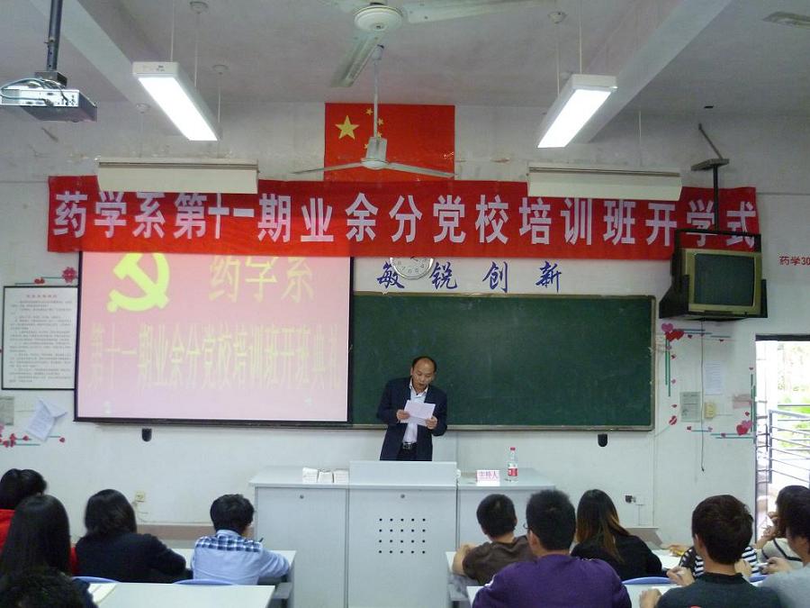 開班典禮在莊嚴的國歌聲中拉開了序幕,首先何烜老師宣讀中共關于藥學系第十一期業(yè)余分黨校的有關通知,隨后何舒瀾老師宣讀第十一期業(yè)余分黨校學員名單及復訓學員名單。接著,學員代表林雅靈同學發(fā)言,她表示今后要認真學習黨的章程,貫徹黨章,加強自身道德修養(yǎng),以實際行動向黨組織靠攏。最后,系黨總支蘇愛華副書記做了重要總結并提出:在黨的十八大精神鼓舞下,希望全體學員要認真自覺地學習新黨章,并以實際行動在學習、生活中起模范帶頭作用,同時努力向黨組織靠攏,爭取早日加入黨組織。