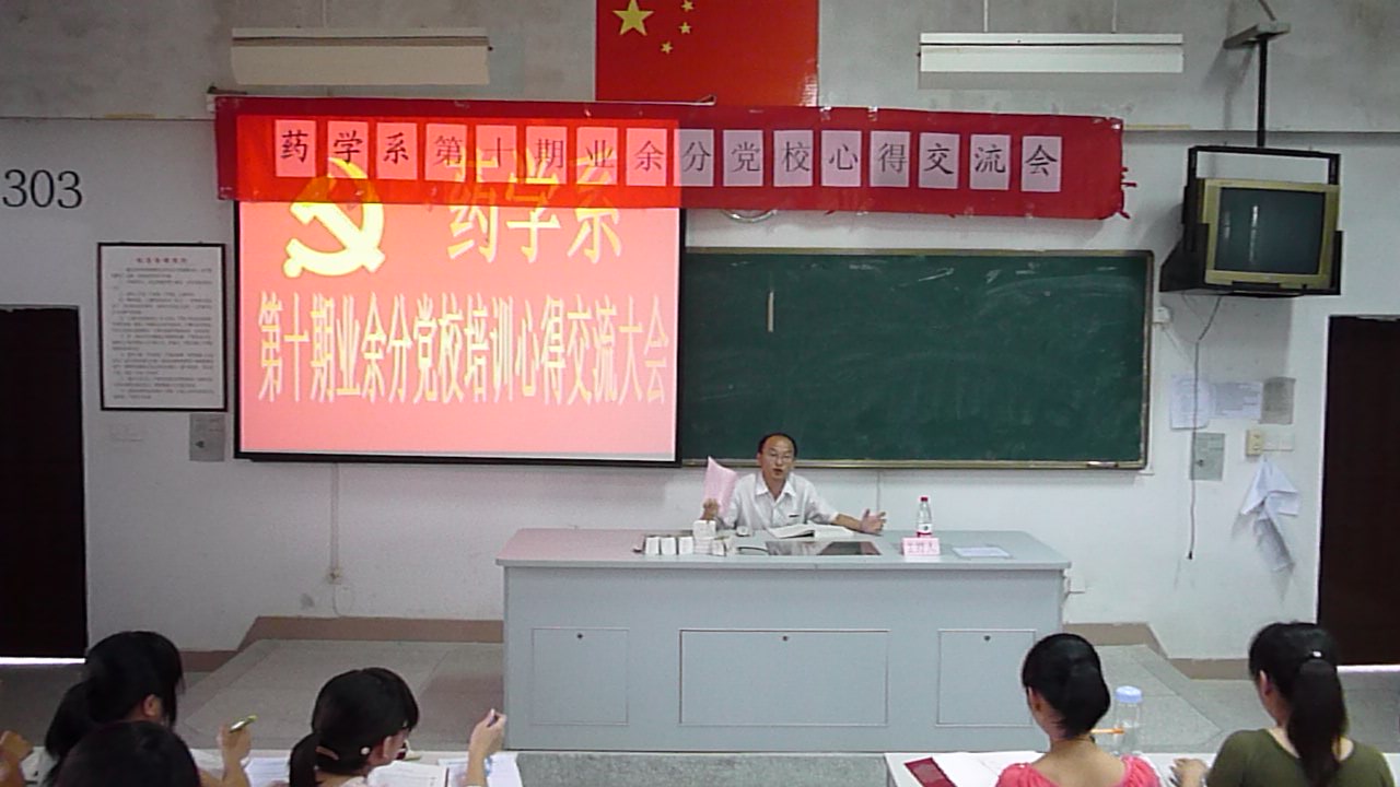 藥學(xué)系第十期業(yè)余分黨校學(xué)員學(xué)習(xí)心得交流會(huì)于5月29日下午在藥學(xué)系第二階梯教室舉行,會(huì)議由陳惠珠同學(xué)主持,系黨總支蘇愛華副書記、系團(tuán)總支副書記陳炳秀老師出席了本次會(huì)議。