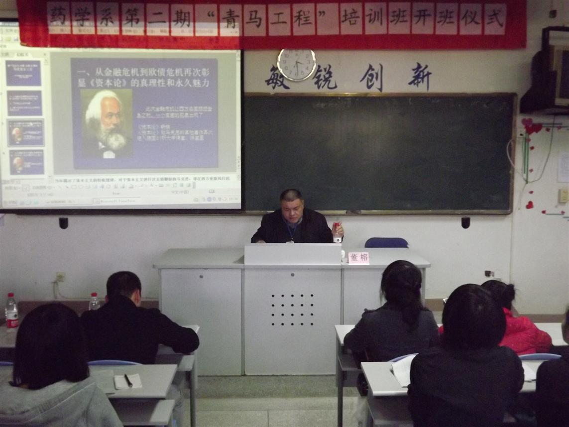 開班儀式在莊嚴(yán)的國(guó)歌中拉開了序幕。首先系團(tuán)總支書記王鈍銳老師宣讀第二期青馬工程培訓(xùn)班學(xué)員名單和“青馬工程”培訓(xùn)班守則,并希望同學(xué)們能夠自覺遵守;接著,學(xué)員代表鄭彬焮同學(xué)發(fā)言,她號(hào)召?gòu)V大學(xué)員珍惜此次的學(xué)習(xí)機(jī)會(huì),做一名名副其實(shí)的青年馬克思主義者和為同學(xué)服務(wù)的學(xué)生干部;接著,院團(tuán)委宋維書記希望全體學(xué)員能夠深刻理解科學(xué)發(fā)展觀和社會(huì)主義核心價(jià)值體系的科學(xué)內(nèi)涵,并用到現(xiàn)實(shí)的學(xué)習(xí)和生活中。最后,藥學(xué)系黨總支蘇愛華書記做重要講話,他希望全體學(xué)員加強(qiáng)自身的思想教育,不斷提高自身的素質(zhì),在同學(xué)中起模范作用。