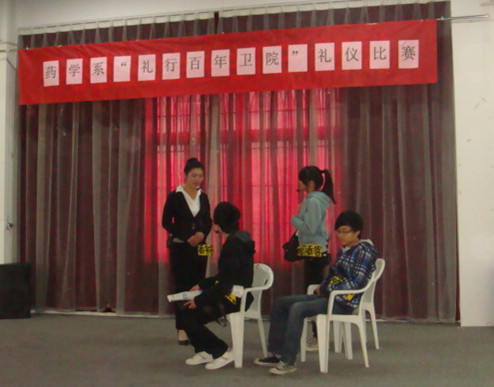 為使我系同學(xué)更深入地了解民族的禮儀文化,讓同學(xué)們深入學(xué)習(xí)面試禮儀、社交禮儀、生活禮儀,藥學(xué)系于3月20日下午舉辦了校園文化藝術(shù)節(jié)之“禮行百年衛(wèi)院”禮儀比賽。此次比賽分為初賽和決賽,經(jīng)過(guò)初賽筆試的選拔,共有五支小組參賽選手晉級(jí)3月20日在學(xué)生活動(dòng)中心進(jìn)行的決賽——情景劇表演,藥學(xué)系團(tuán)總支書記王鈍銳老師、副書記陳炳秀老師、陳瑜老師、藥學(xué)系學(xué)生會(huì)主席鄭彬焮同學(xué)、副主席何斐同學(xué)擔(dān)任此次決賽評(píng)委。
