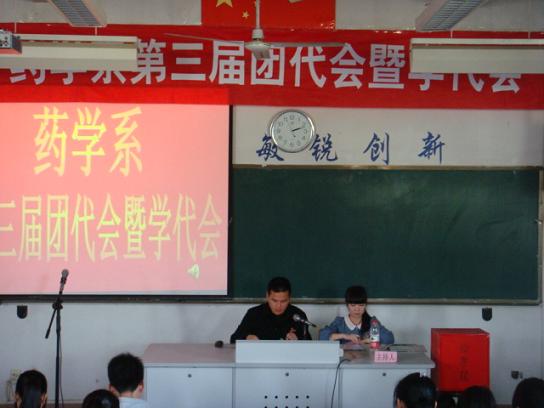 2012年3月27日下午,藥學系第三屆團學代表大會在藥學系第一階梯教室召開。院領導魏立娜副院長、院學工處黃銘珊處長、院團委副書記宋維、藥學系黨總支蘇愛華副書記、醫(yī)學技術系團總支書記黃小芳老師及各兄弟系學生會主席以及學生代表出席本次大會。