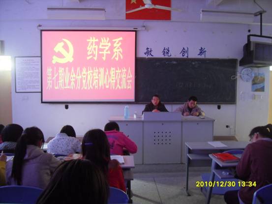 藥學(xué)系第七期業(yè)余分黨校培訓(xùn)心得交流會(huì)于12月30日中午在藥學(xué)系第一階梯教室舉行,交流會(huì)由系團(tuán)總支副書(shū)記王鈍銳老師主持,系黨總支歐春木書(shū)記出席了本次交流會(huì)。