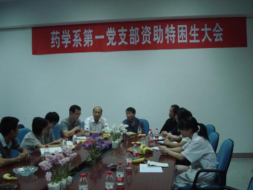 藥學(xué)系第一黨支部于2010年6月9日下午四點(diǎn)在藥學(xué)系會(huì)議室召開(kāi)資助特困生大會(huì)。院黨委陳雄副書(shū)記、第一黨支部全體黨員及21名資助對(duì)象參加了本次大會(huì)。