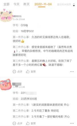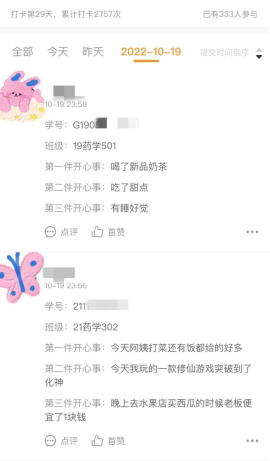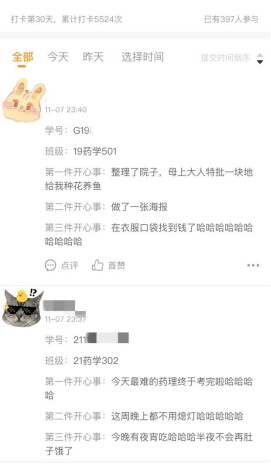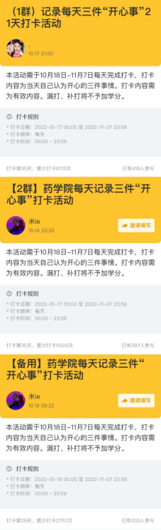 本次,藥學(xué)院以每天記錄三件“開心事”21天打卡活動為主推,組織同學(xué)們線上打卡“開心事”,引導(dǎo)同學(xué)們學(xué)會多發(fā)現(xiàn)生活中美好的人和事,以積極向上的心態(tài)面對生活,此次活動吸引力千余名學(xué)生參與,累計打卡人次超1.4萬。