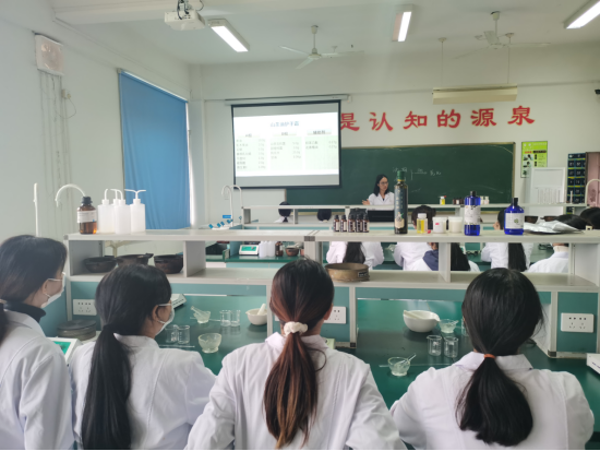 ↑林燕喃副教授為同學(xué)們講解護(hù)手霜的主要成分、各個成分的作用及配比