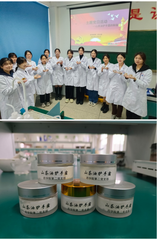 藥學(xué)院第二黨支部致力于發(fā)揮專業(yè)特色,將黨建融入教科研,引領(lǐng)專業(yè)發(fā)展,培育時代新人。2022年12月1日,支部開展了以“黨建引領(lǐng)專業(yè) 紅色領(lǐng)航育才”為主題的黨日活動。本次活動由支部書記劉丹丹組織,支部黨員帶領(lǐng)藥品生產(chǎn)技術(shù)專業(yè)的同學(xué)制作完成多種配方的藥妝護(hù)手霜。
