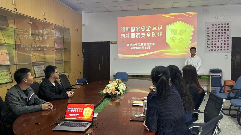 安而不忘危,存而不忘亡,治而不忘亂。2024年4月15日是第9個(gè)全民國(guó)家安全教育日,為增強(qiáng)全民國(guó)家安全意識(shí),維護(hù)國(guó)家安全,4月11日,藥學(xué)院學(xué)生第三黨支部書記陳翰開展題為《增強(qiáng)國(guó)家安全意識(shí),筑牢國(guó)家安全防線》主題黨課,學(xué)生第三黨支部全體教師黨員參加。