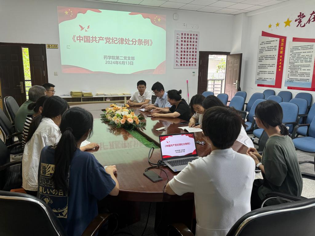 為進一步牢固樹立黨員黨章黨規(guī)黨紀(jì)意識,引導(dǎo)全體黨員教師嚴(yán)格遵守黨的工作紀(jì)律和生活紀(jì)律,自覺做到守紀(jì)律、講規(guī)矩、知敬畏、存戒懼,6月13日上午,藥學(xué)院第二黨支部在藥學(xué)院會議室開展《中國共產(chǎn)黨紀(jì)律處分條例》(以下簡稱《條例》)的專題學(xué)習(xí)會。本次會議由黨支部書記劉丹丹主持,全體教師黨員積極參與。