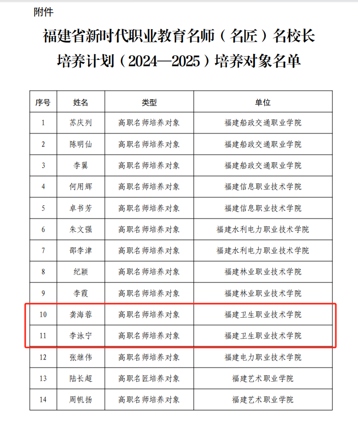 近日,福建省教育廳公布《新時(shí)代職業(yè)教育名師(名匠)名校長培養(yǎng)計(jì)劃(2024-2025)培養(yǎng)對象名單》,我校龔海蓉、李泳寧兩位教師成功入選福建省新時(shí)代職業(yè)教育高職名師培養(yǎng)對象。