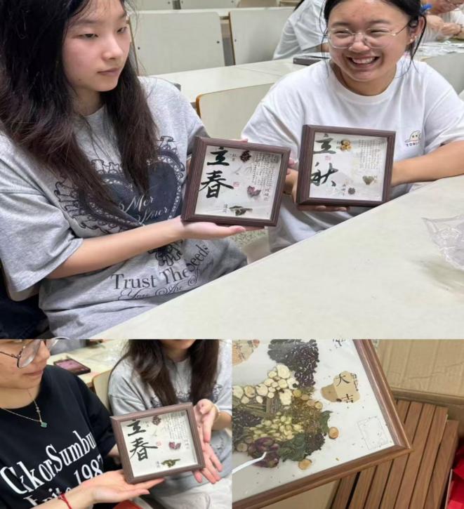 活動(dòng)圍繞“識(shí)本草、制畫(huà)品、傳心意”三大環(huán)節(jié)展開(kāi)。“節(jié)氣本草識(shí)”環(huán)節(jié),同學(xué)間交流與“二十四節(jié)氣”相關(guān)的草本植物特性,如立春的辛夷、立秋的菊花等;“畫(huà)品手作”環(huán)節(jié),同學(xué)們精選各類(lèi)草本藥材,巧妙搭配成“立春”“立秋”等節(jié)氣主題的本草畫(huà),也將對(duì)心理健康的期許融入創(chuàng)作。同學(xué)們專(zhuān)注于藥材擺放、裝裱,在沉浸式創(chuàng)作中釋放壓力,每一幅本草畫(huà)都成為獨(dú)一無(wú)二的心靈載體。
