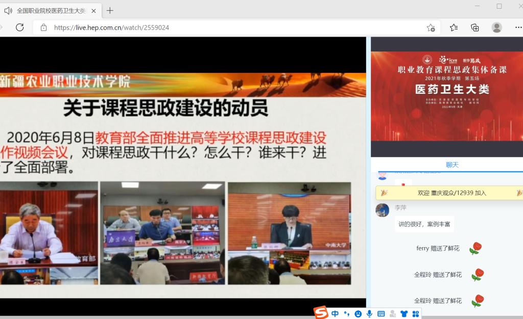 為強化課程思政建設,將課程思政貫穿教育教學全過程,著力培養(yǎng)學生“敬佑生命、救死扶傷、甘于奉獻、大愛無疆”的醫(yī)者精神,實現課程育人目標,落實立德樹人根本任務。2021 年 9 月 25 日至26 日,醫(yī)學系組織教師在線觀看《全國職業(yè)院校醫(yī)藥衛(wèi)生專業(yè)大類課程思政集體備課》,并于9月30日在實訓樓311會議室圍繞醫(yī)藥衛(wèi)生專業(yè)大類課程思政示范課程建設開展交流研討。