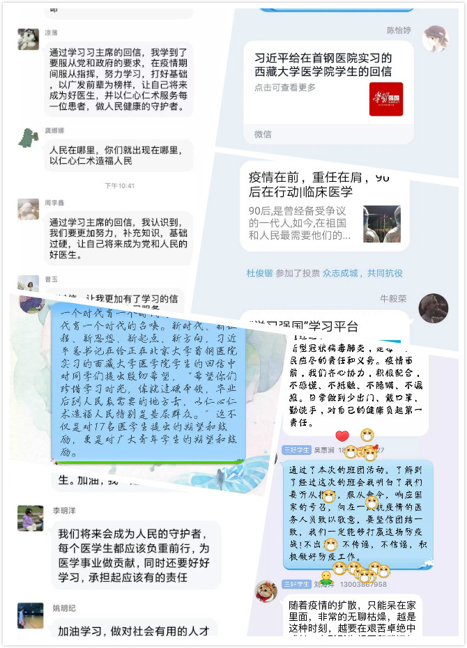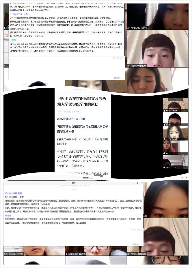 2月21日,習(xí)近平總書記給正在北京大學(xué)首鋼醫(yī)院實(shí)習(xí)的西藏大學(xué)醫(yī)學(xué)院學(xué)生回信,肯定他們獻(xiàn)身西藏醫(yī)療衛(wèi)生事業(yè)的志向,勉勵(lì)他們練就過硬本領(lǐng)、服務(wù)基層人民,并向他們以及藏區(qū)各族群眾致以節(jié)日的問候和美好的祝愿。隨后引起我系師生的熱議,2月24日上午,在我系團(tuán)總支書記陳清清、副書記謝林輝主持下,組織開展了線上學(xué)習(xí)會議,18級團(tuán)學(xué)干部、17級實(shí)習(xí)生代表共同參加了學(xué)習(xí);25日晚上,我系團(tuán)總支組織各團(tuán)支部召開線上主題團(tuán)日活動。