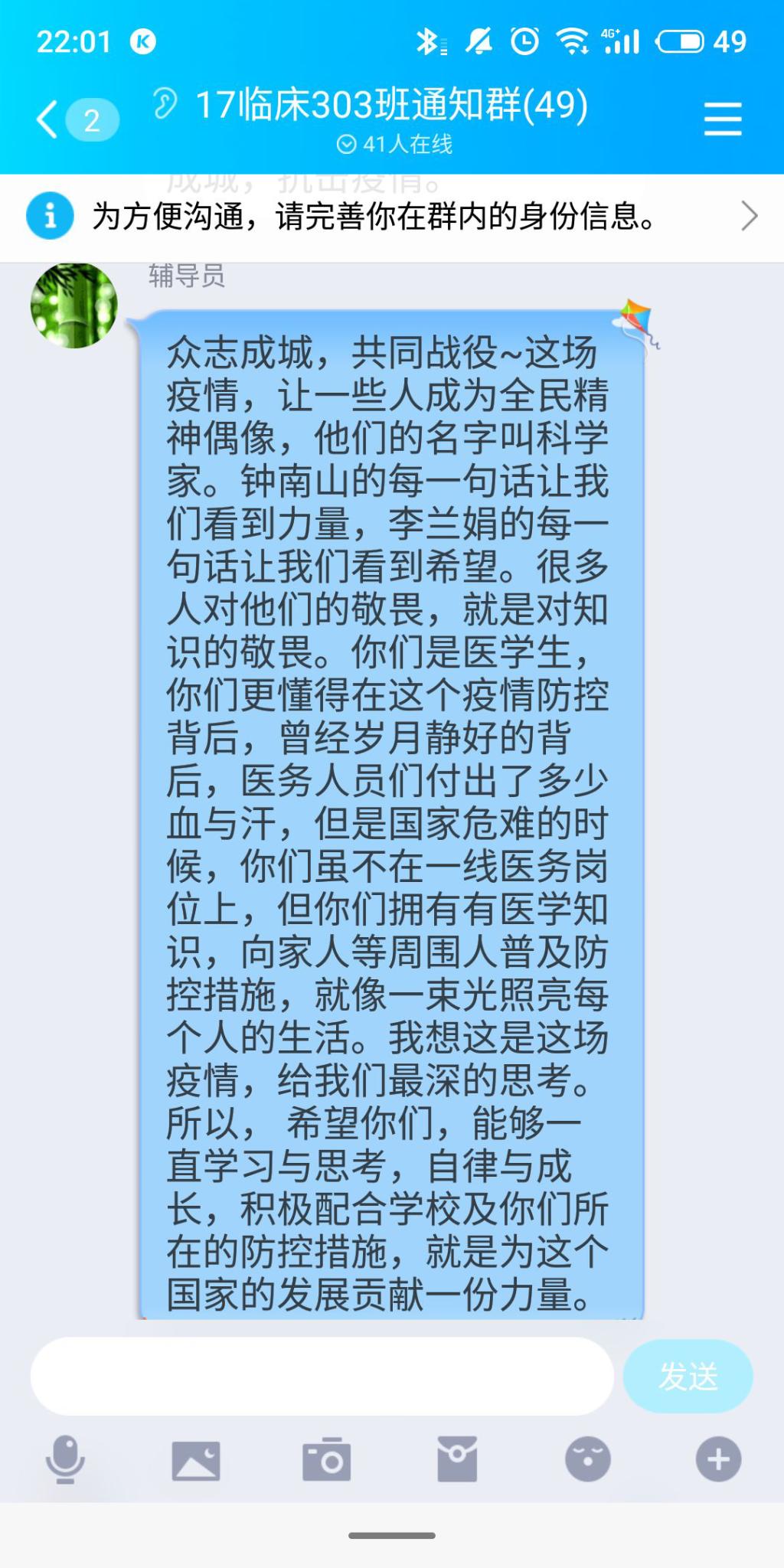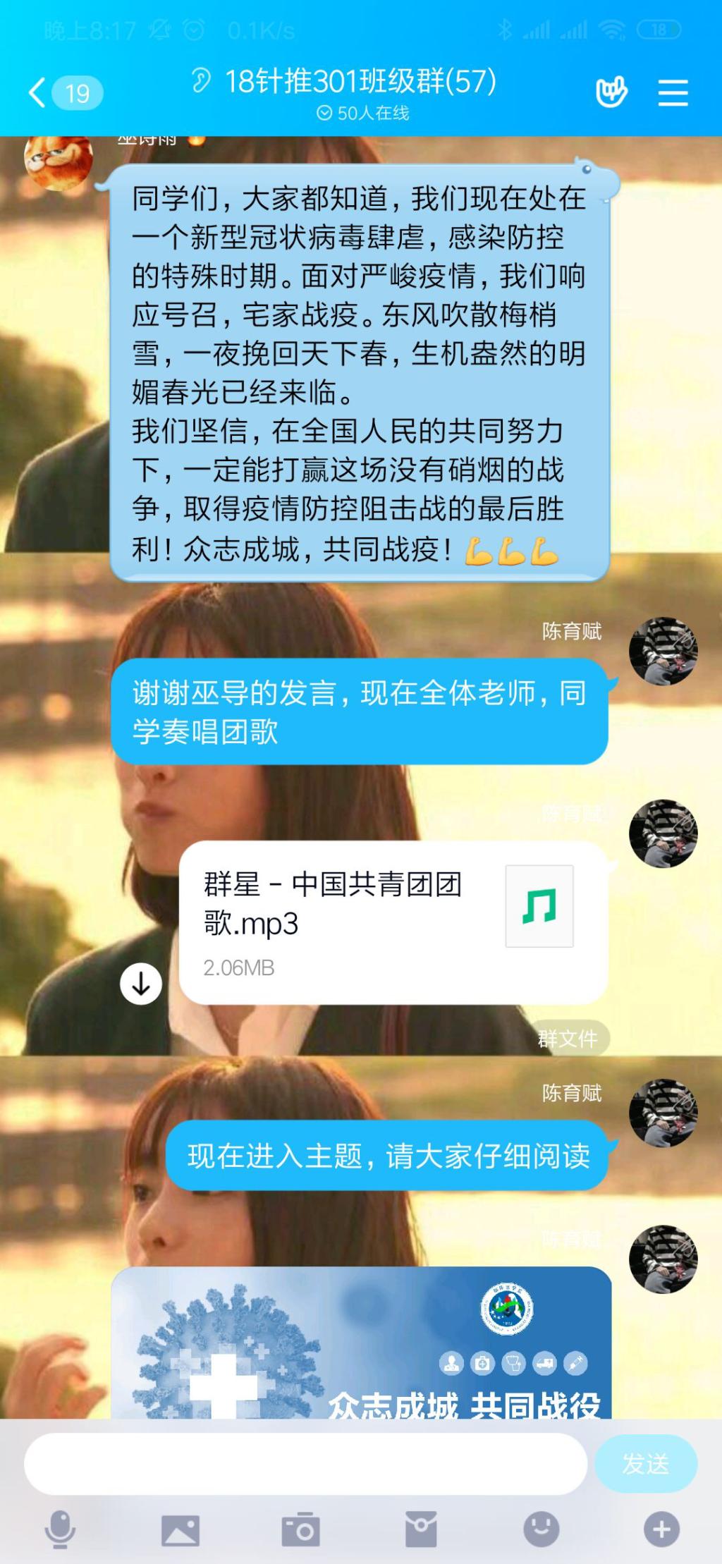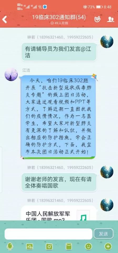 在各班團支書的帶領(lǐng)下全體團員學生在各班群里簽到,并在線上共同合唱國歌、團歌。各班級輔導員參加了線上團日活動并紛紛發(fā)言。