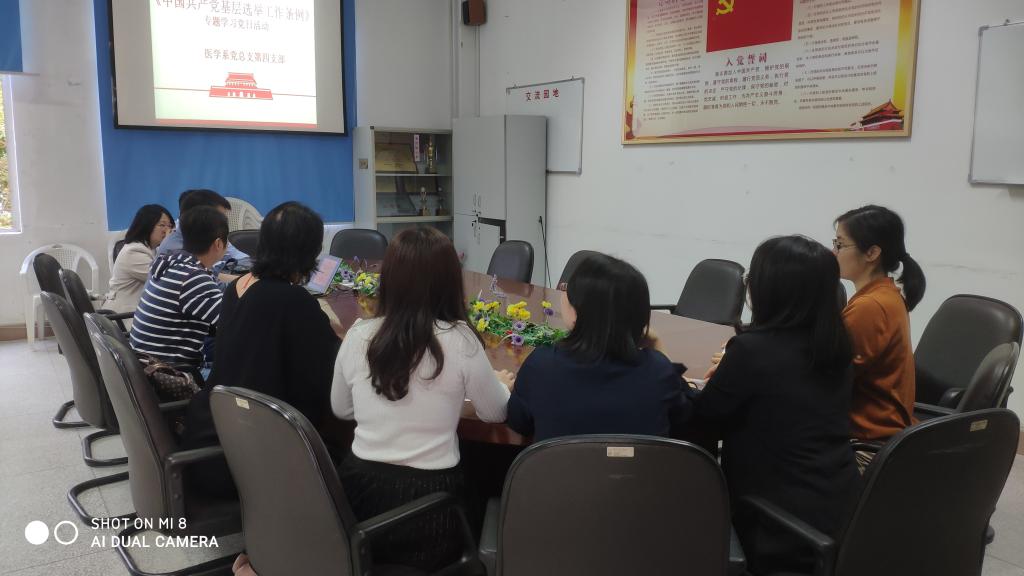 11月26日,醫(yī)學(xué)系第四黨支部在醫(yī)學(xué)基礎(chǔ)部會(huì)議室開(kāi)展《中國(guó)共產(chǎn)黨基層組織選舉工作條例》專題學(xué)習(xí)黨日活動(dòng)。醫(yī)學(xué)系第四黨支部書記鄧元榮同志主持,支部全體黨員參加了本次專題學(xué)習(xí)。