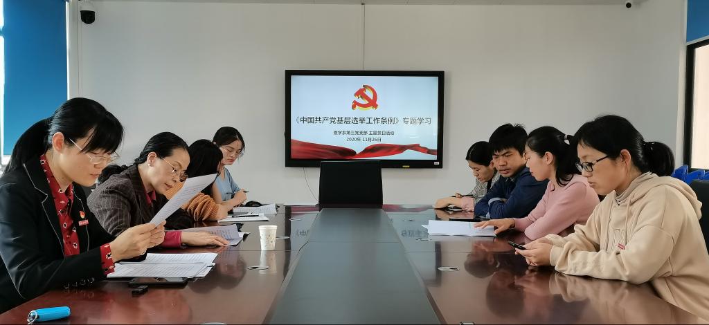 為深入貫徹習(xí)近平新時代中國特色社會主義思想,貫徹落實新時代黨的建設(shè)總要求和新時代黨的組織路線,堅持和加強黨的全面領(lǐng)導(dǎo),堅持黨要管黨、全面從嚴(yán)治黨,增強基層黨組織政治功能、提升基層黨組織組織力,醫(yī)學(xué)系第三黨支部于2020年11月26日在實訓(xùn)樓311開展《中國共產(chǎn)黨基層組織選舉工作條例》(以下簡稱《條例》)專題學(xué)習(xí)。學(xué)院黨委委員、副院長鄭翠紅與支部其他黨員一起參加本次的主題黨日活動。