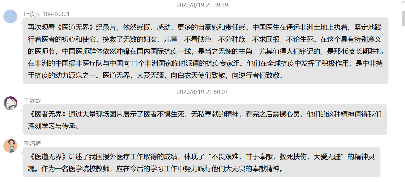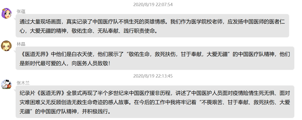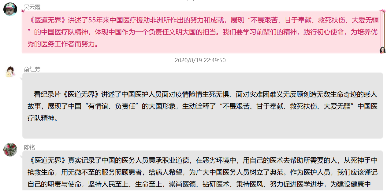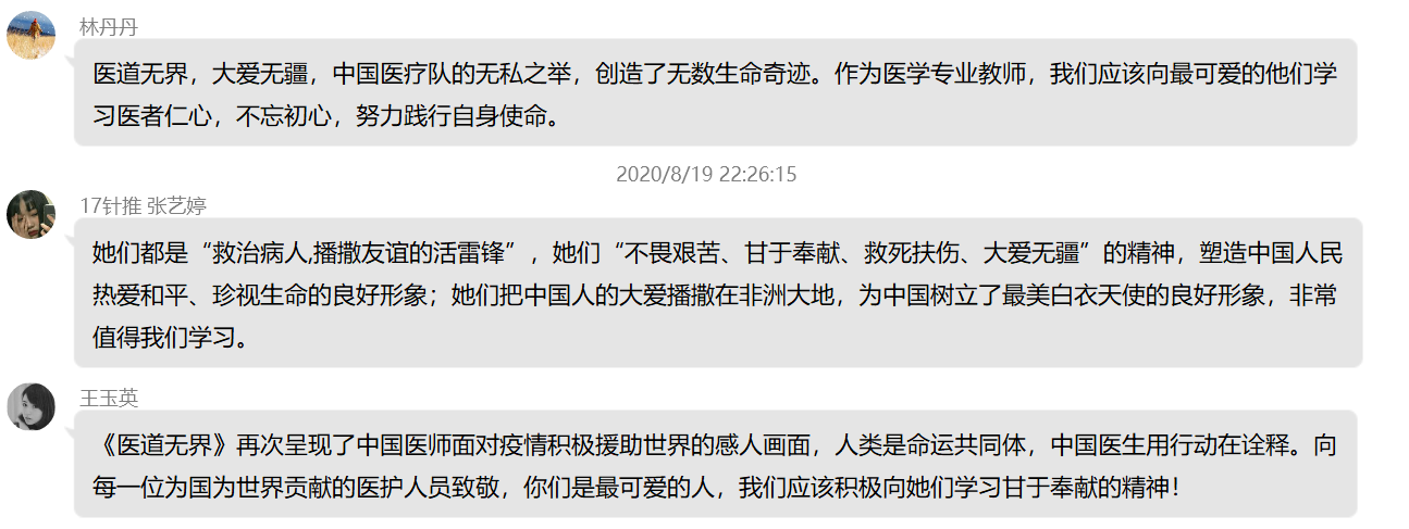 觀看之后,黨員紛紛發(fā)表感言,《醫(yī)道無(wú)界》體現(xiàn)了中國(guó)援外醫(yī)護(hù)人員不畏艱難、甘于奉獻(xiàn)、救死扶傷、大愛無(wú)疆的精神。我們作為醫(yī)學(xué)院校黨員教師,更應(yīng)在今后的工作中努力踐行和弘揚(yáng)這種大無(wú)畏的奉獻(xiàn)精神。在這個(gè)具有特別意義的醫(yī)師節(jié),中國(guó)醫(yī)師群體依然沖鋒在國(guó)內(nèi)國(guó)際抗疫一線,醫(yī)道無(wú)界、大愛無(wú)疆,向白衣天使們致敬,向逆行者們致敬。