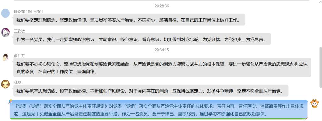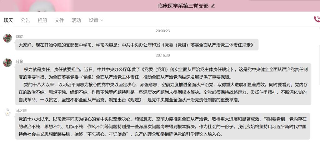 5月10日晚,臨床系第三黨支部于通過支部QQ群召開線上學(xué)習(xí)活動,此次學(xué)習(xí)內(nèi)容為《黨委(黨組)落實全面從嚴治黨主體責任規(guī)定》(以下簡稱《規(guī)定》),由支部書記陳銘同志主持。