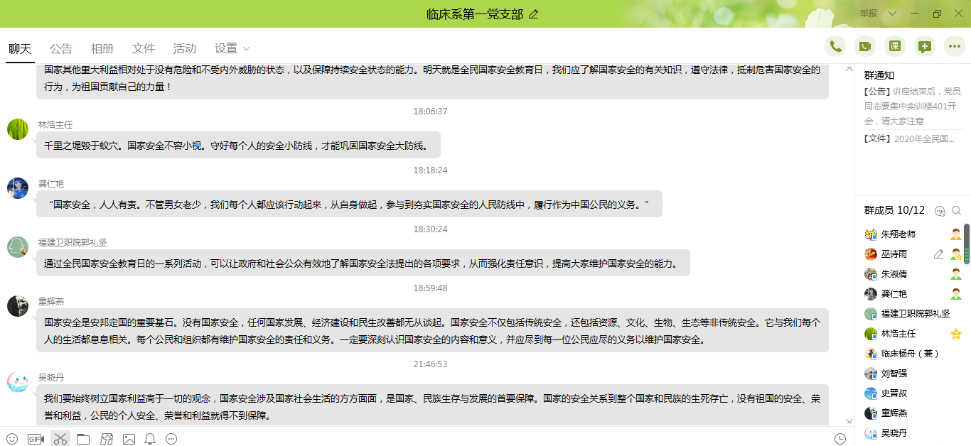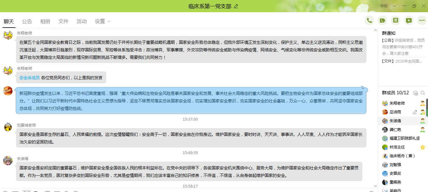 今年4月15日是第5個全民國家安全教育日,今年的主題是“堅持總體國家安全觀,統(tǒng)籌傳統(tǒng)安全和非傳統(tǒng)安全,為決勝全面建成小康社會提供堅強保障”。為深入學(xué)習(xí)理解習(xí)近平總書記提出的“總體國家安全觀”,提高全員維護(hù)國家安全的意識。4月15日,臨床系第一黨支部開展“國家安全教育日”主題黨日活動,此次活動由支部書記朱翔同志主持,支部全體黨員參加。