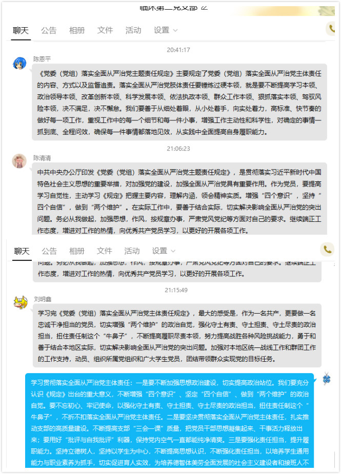 通過認真自學并研讀文件,黨員同志們針對學習紛紛發(fā)表心得體會,在線上展開討論。