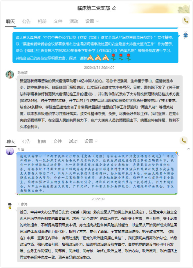 近日,臨床醫(yī)學系第二黨支部組織全體黨員在線學習中共中央辦公廳印發(fā)《黨委(黨組)落實全面從嚴治黨主體責任規(guī)定》、于偉國主持召開福建省委常委會會議部署泉州市欣佳酒店坍塌事故處置和安全隱患大排查大整治工作,以及《福建衛(wèi)生職業(yè)技術學院2020年春季學期開學工作預案》和“兩案八制”等相關制度。