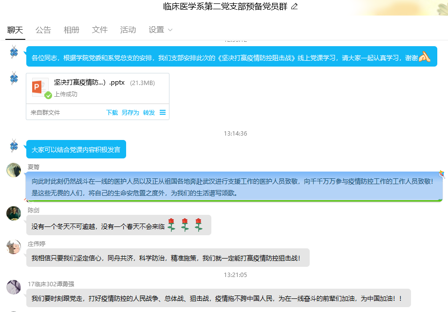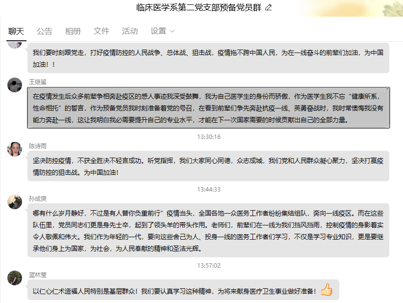 黨員同志們積極上線留言,表達(dá)此次線上黨課的感受。課后,大家紛紛表示要牢記習(xí)近平總書記囑托,堅(jiān)守崗位,扎實(shí)工作,以奮戰(zhàn)在新冠肺炎疫情防控斗爭中的醫(yī)務(wù)工作者為榜樣,聽黨指揮,積極工作,盡早投身祖國的教育、醫(yī)療衛(wèi)生事業(yè)中。
