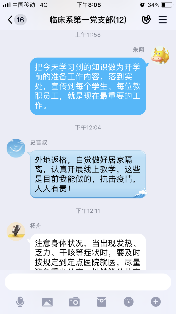 2020年2月24日上午,臨床醫(yī)學系第一黨支部組織全體黨員在線觀看學習復旦大學“新冠肺炎防控第一課”網(wǎng)絡直播,由復旦大學附屬華山醫(yī)院感染科主任張文宏與復旦大學上海醫(yī)學院副院長吳凡聯(lián)袂開課。線上聆聽兩位專家講述“新冠肺炎防控第一課”,聚焦提升公民健康素養(yǎng)。課程結(jié)束,臨床醫(yī)學系第一黨支部對“新冠肺炎防控第一課”進行線上研討。黨員同志們針對今天的學習紛紛發(fā)表了各自的體會和收獲。