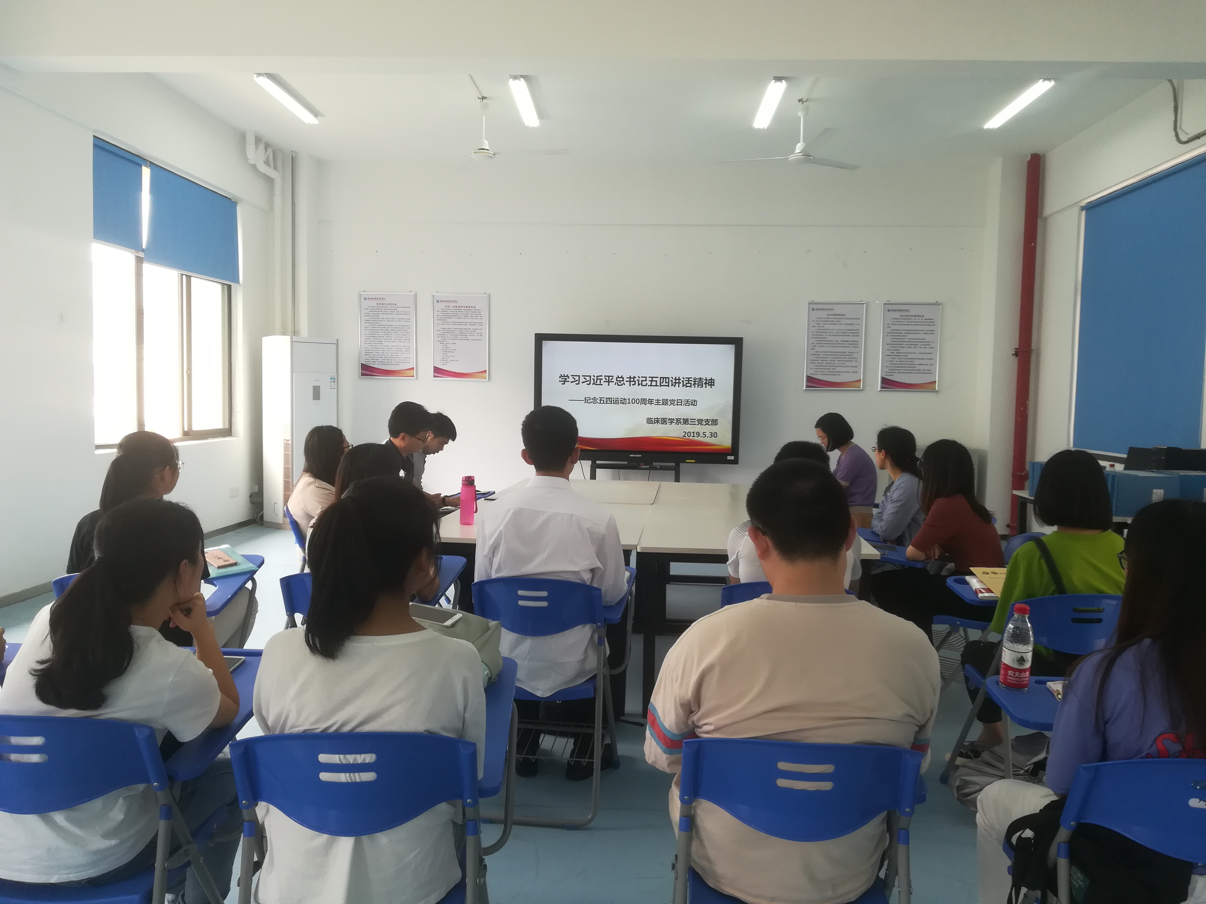 為深入貫徹落實(shí)《中共教育部黨組關(guān)于教育系統(tǒng)認(rèn)真學(xué)習(xí)貫徹習(xí)近平總書記在紀(jì)念五四運(yùn)動(dòng)100周年大會上重要講話精神的通知》精神,弘揚(yáng)五四精神,落實(shí)立德樹人根本任務(wù),2019年5月30日,臨床醫(yī)學(xué)系第三黨支部組織學(xué)習(xí)了習(xí)近平總書記在紀(jì)念五四運(yùn)動(dòng)100周年大會上的重要講話精神。會議由臨床醫(yī)學(xué)系第三黨支部書記陳銘老師主持,支部黨員及部分學(xué)生入黨積極分子參加了本次活動(dòng)。 活動(dòng)首先播放了電影《建黨偉業(yè)》“五四運(yùn)動(dòng)”片段,回顧了五四運(yùn)動(dòng)發(fā)生的背景與過程。影片中,一個(gè)舉著血書“冤”字的女大學(xué)生跪在總統(tǒng)府前情愿,回答軍警為什么不到檢察廳喊冤時(shí),她含淚說:“冤情太深,檢察廳接不了我的狀子?!敝笸春?“我是為四萬萬同胞喊冤啊!”這一聲猶如千鈞之重的巨石狠狠砸在了每一個(gè)人的心上,與會者無不被那個(gè)熱血沸騰激情澎湃的時(shí)代所震撼,被那群心系國家情牽百姓的先驅(qū)所感動(dòng),被那種為國獻(xiàn)身死而后已的精神折服。隨后,全體黨員教師及學(xué)生入黨積極分子共同學(xué)習(xí)了講話全文,張?zhí)N同志重點(diǎn)宣讀了習(xí)近平總書記重要講話中對青年人提出的六點(diǎn)希望,并結(jié)合以往教學(xué)過程中的所見所聞所感發(fā)表了對青年學(xué)生的看法和期望。接著,2018級臨床301班周天陽同學(xué)代表與會學(xué)生發(fā)表學(xué)習(xí)感想,表達(dá)了青年永遠(yuǎn)高舉五四精神旗幟,勇敢接力,肩負(fù)起時(shí)代重任的決心。