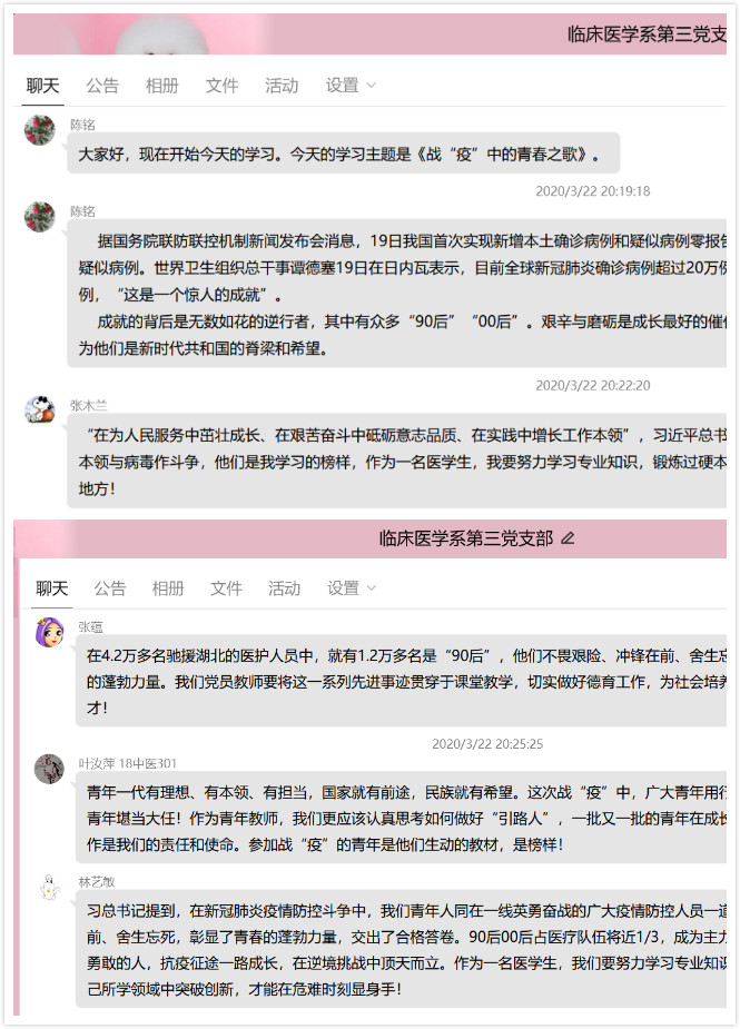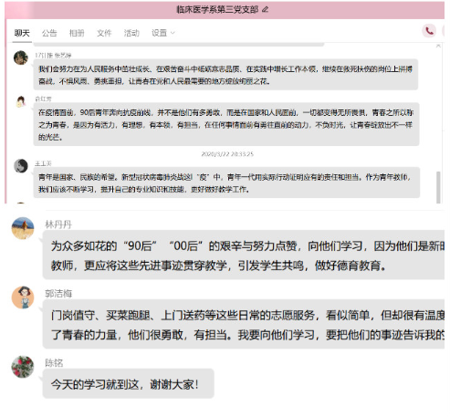 3月22日晚上,臨床醫(yī)學(xué)系第三黨支部利用在線平臺開展主題為“戰(zhàn)疫中的青年力量”的學(xué)習(xí)活動,此次學(xué)習(xí)由支部書記陳銘書記主持。