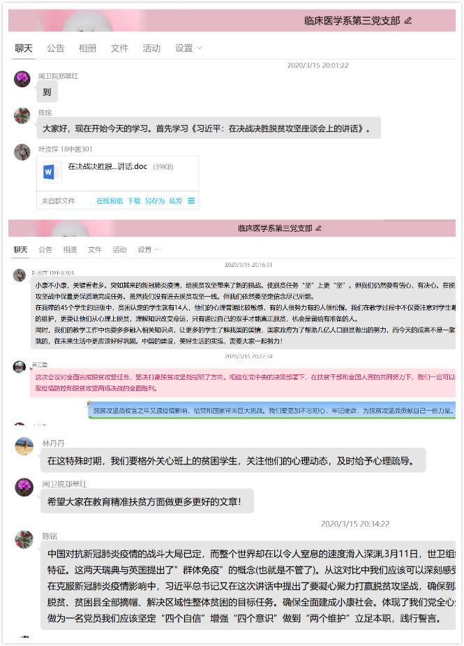 3月15日晚上,臨床醫(yī)學(xué)系第三黨支部利用在線平臺(tái)開(kāi)展理論學(xué)習(xí),此次學(xué)習(xí)由支部書記陳銘書記主持,內(nèi)容為《習(xí)近平總書記在決戰(zhàn)決勝脫貧攻堅(jiān)座談會(huì)上的講話(2020年3月6日)》。
