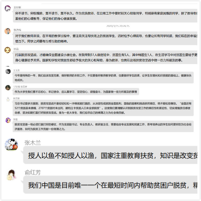 在脫貧攻堅(jiān)收官之年突遇新冠肺炎疫情影響,給脫貧攻堅(jiān)各項(xiàng)工作任務(wù)帶來(lái)了挑戰(zhàn)。這次會(huì)議對(duì)全面完成脫貧攻堅(jiān)任務(wù)、堅(jiān)決打贏脫貧攻堅(jiān)戰(zhàn)指明了方向。學(xué)習(xí)完畢,與會(huì)同志們紛紛表示,要堅(jiān)定信念,相信在黨中央的決策部署下,在扶貧干部和全國(guó)人民的共同努力下,我們一定可以?shī)Z取疫情防控和脫貧攻堅(jiān)兩場(chǎng)決戰(zhàn)的全面勝利。黨員教師們還從實(shí)際出發(fā),提出不僅要更加關(guān)注貧困學(xué)生,及時(shí)給予他們心理疏導(dǎo),而且要從專業(yè)角度為學(xué)生謀求更好的職業(yè)發(fā)展,為社會(huì)經(jīng)濟(jì)服務(wù),為脫貧攻堅(jiān)戰(zhàn)貢獻(xiàn)一份力量。學(xué)生預(yù)備黨員也表示,要更加關(guān)心、幫助身邊的貧困同學(xué),做一些力所能及的事情,為脫貧攻堅(jiān)工作盡自己的綿薄之力。