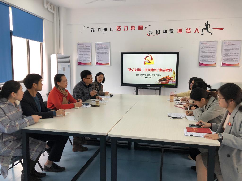 為鞏固深化中央八項(xiàng)規(guī)定精神成果,勉勵(lì)支部黨員干部自覺(jué)做到知敬畏、存戒懼、守底線(xiàn),切實(shí)把黨規(guī)黨紀(jì)要求轉(zhuǎn)化為個(gè)人思想和行為自覺(jué),確保2020年春節(jié)風(fēng)清氣正。1月16日下午,臨床醫(yī)學(xué)系第三黨支部在實(shí)訓(xùn)樓401會(huì)議室開(kāi)展“持之以恒,正風(fēng)肅紀(jì)”廉潔教育主題黨日活動(dòng),學(xué)校鄭翠紅副校長(zhǎng)以普通黨員身份參加了此次主題黨日活動(dòng)?;顒?dòng)由支部書(shū)記陳銘同志主持。