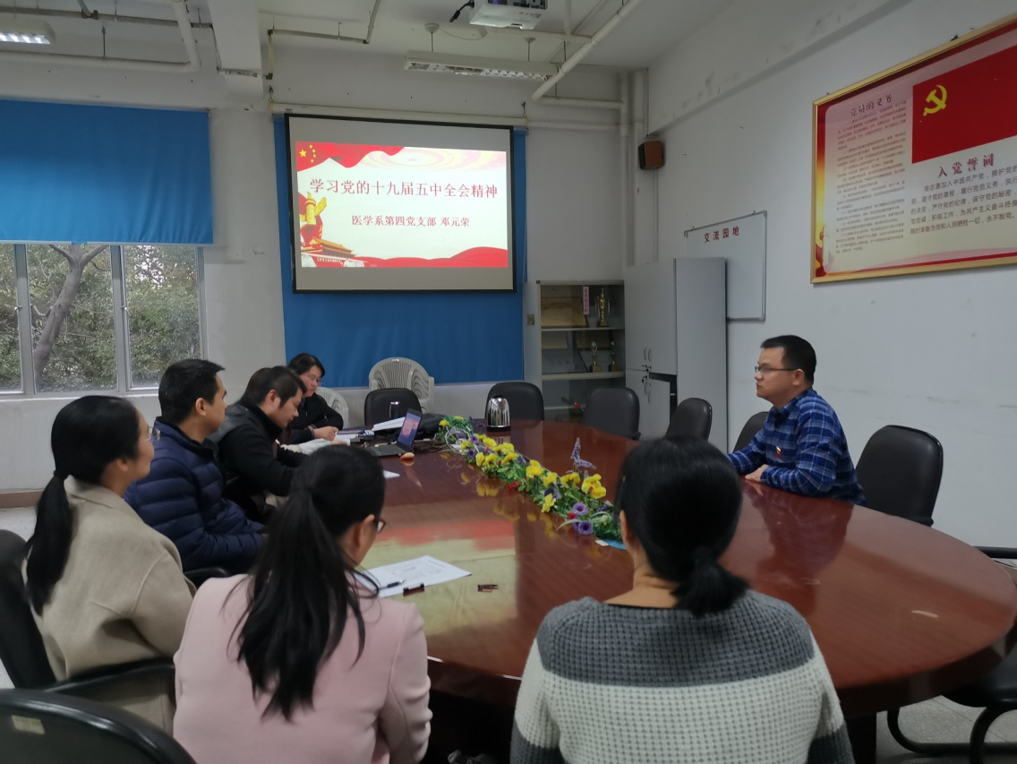 為深入學習貫徹黨的十九屆五中全會精神,12月10日下午,醫(yī)學系第四黨支部書記鄧元榮同志在基礎(chǔ)部會議室為全體黨員開展“學習黨的十九屆五中全會精神”為題的黨課。