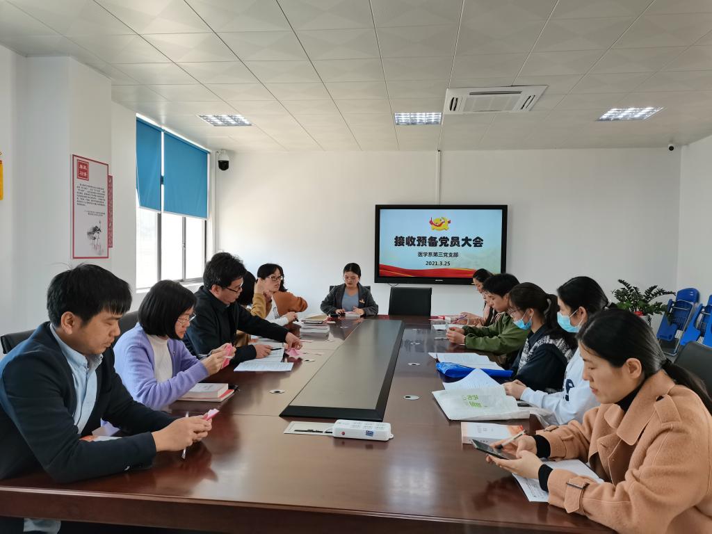 2021年3月25日中午,醫(yī)學(xué)系第三黨支部在實(shí)訓(xùn)樓311室召開接收預(yù)備黨員大會。會議由支部書記陳銘主持,支部11名正式黨員因事請假2人,其余9名黨員全部參會。