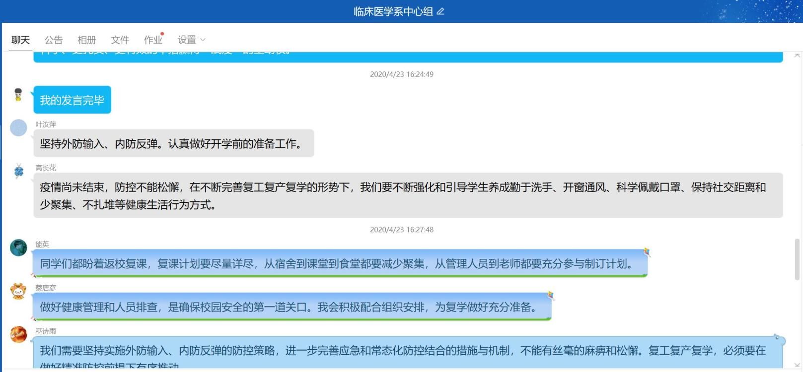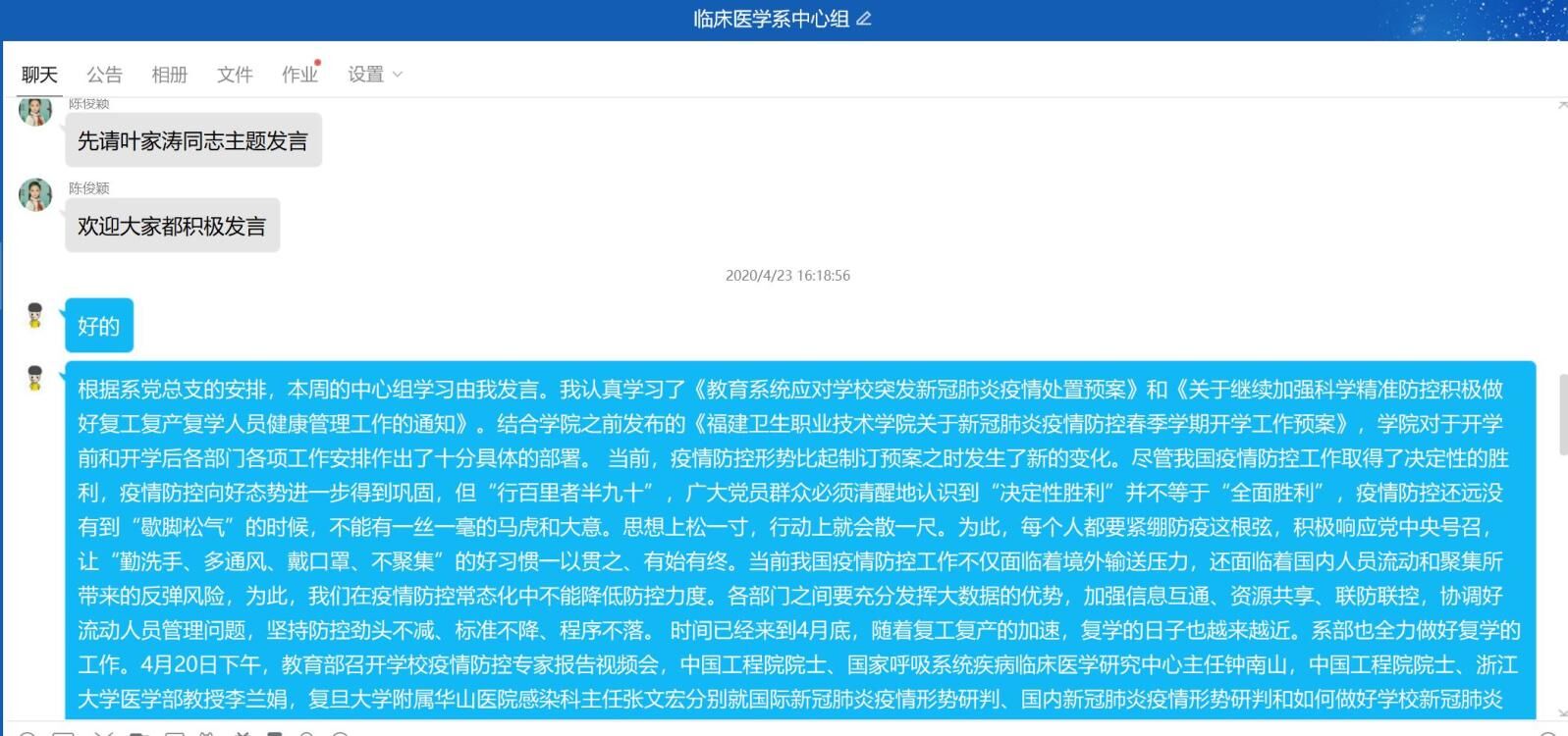 2020年4月23日,臨床醫(yī)學(xué)系在線召開中心組(擴大)學(xué)習(xí)會議,學(xué)習(xí)《教育系統(tǒng)應(yīng)對學(xué)校突發(fā)新冠肺炎疫情處置預(yù)案》、《關(guān)于繼續(xù)加強科學(xué)精準(zhǔn)防控積極做好復(fù)工復(fù)產(chǎn)復(fù)學(xué)人員健康管理工作的通知》等,會議由臨床醫(yī)學(xué)系黨總支負責(zé)人陳俊穎同志主持。