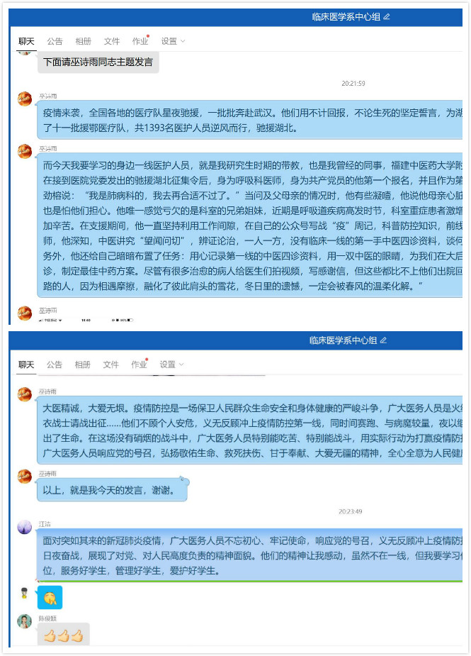 正值疫情暴發(fā)期間,中心組成員在家抗疫仍不忘學(xué)習(xí)。會(huì)中,巫詩(shī)雨做主題發(fā)言,她講述了福建中醫(yī)藥大學(xué)附屬人民醫(yī)院肺病科副主任醫(yī)師林勁榕主任的優(yōu)秀事跡。一月份在接到醫(yī)院黨委發(fā)出的馳援湖北征集令后,身為呼吸科醫(yī)師,身為共產(chǎn)黨員的林勁榕主任第一個(gè)報(bào)名,并且作為第一批援鄂醫(yī)療隊(duì)成員,赴武漢金銀潭醫(yī)院支援。在支援期間,他一直堅(jiān)持利用工作間隙,在自己的公眾號(hào)寫(xiě)戰(zhàn)“疫”周記,科普防控知識(shí),前線動(dòng)態(tài),以及診療心得。他說(shuō)“我們都是飛雪中趕路的人,因?yàn)橄嘤瞿Σ粒诨吮舜思珙^的雪花,冬日里的遺憾,一定會(huì)被春風(fēng)的溫柔化解?!?在這場(chǎng)沒(méi)有硝煙的戰(zhàn)斗中,廣大醫(yī)務(wù)人員特別能吃苦、特別能戰(zhàn)斗,用實(shí)際行動(dòng)為打贏疫情防控阻擊戰(zhàn)筑牢了生命防線、提供了專(zhuān)業(yè)支撐。我國(guó)廣大醫(yī)務(wù)人員響應(yīng)黨的號(hào)召,弘揚(yáng)敬佑生命、救死扶傷、甘于奉獻(xiàn)、大愛(ài)無(wú)疆的精神,全心全意為人民健康服務(wù),值得我們學(xué)習(xí)。