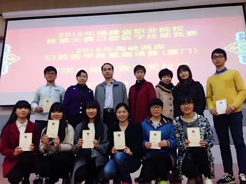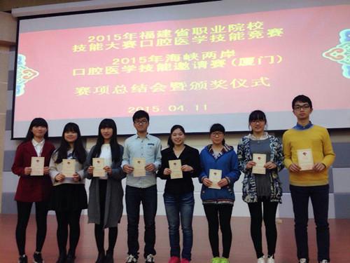 由福建省教育廳、福建省人力資源和社會保障廳、福建省衛(wèi)生和計劃生育委員會、福建省總工會、共青團福建省委、福建省中華職業(yè)教育社主辦,廈門醫(yī)學(xué)高等??茖W(xué)校承辦的2015年福建省職業(yè)院校技能大賽口腔醫(yī)學(xué)技能競賽暨2015年海峽兩岸口腔醫(yī)學(xué)技能邀請賽(廈門)于2015年4月11日在廈門醫(yī)學(xué)高等??茖W(xué)校如期舉辦了。我省廈門醫(yī)學(xué)高等??茖W(xué)校、漳州衛(wèi)生職業(yè)技術(shù)學(xué)院、泉州醫(yī)學(xué)高等??茖W(xué)校及我院四所高職院校的口腔醫(yī)學(xué)專業(yè)學(xué)生以團體形式各自組隊參賽,每所院校兩隊,共8隊參加了本次省口腔醫(yī)學(xué)技能大賽。比賽共分4個組進行,分別為牙體雕刻組、全口義齒排列組、窩洞制備組、牙體制備組。本次我省口腔醫(yī)學(xué)技能競賽承辦方廈門醫(yī)高專還邀請了臺灣的中臺科技大學(xué)、臺北醫(yī)學(xué)大學(xué)、天津醫(yī)高專、肇慶醫(yī)高專、深圳衛(wèi)生職業(yè)技術(shù)學(xué)院、蘇州衛(wèi)生職業(yè)技術(shù)學(xué)院、廣東惠州衛(wèi)職院等院校的口腔專業(yè)學(xué)生與我省四所高職院校的口腔學(xué)生共73名選手同場競技。