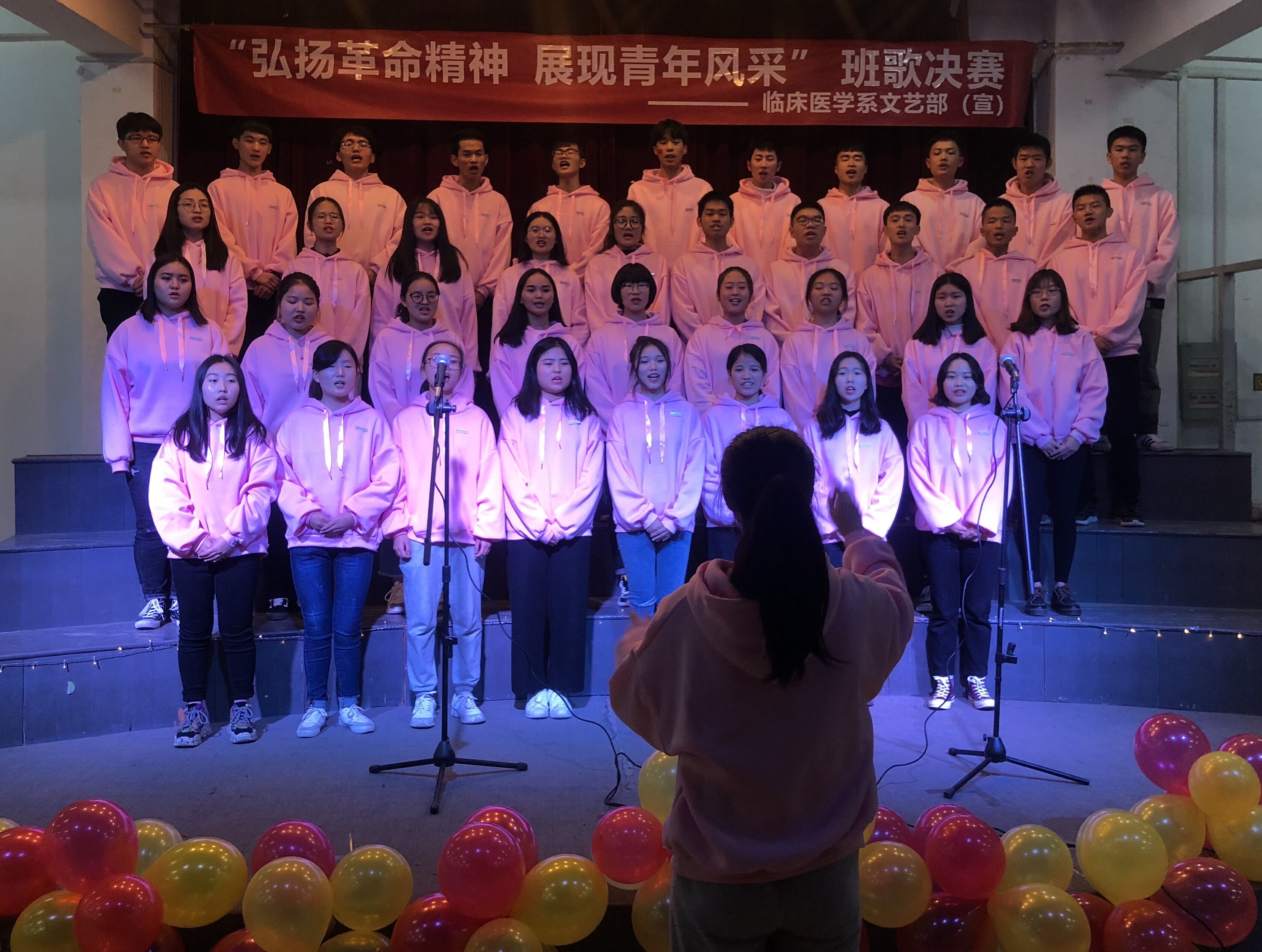 為紀(jì)念“12.9”學(xué)生愛國運(yùn)動,臨床醫(yī)學(xué)系于12月9日晚上在明湖餐廳三樓舉辦以“弘揚(yáng)革命精神,展現(xiàn)青年風(fēng)采”為主題的班班有歌聲合唱比賽決賽。團(tuán)總支謝林輝副書記、輔導(dǎo)員陳清清老師、葉汝萍老師及17級兩委會成員為此次合唱比賽擔(dān)任評委。