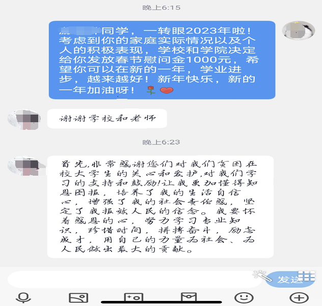 歲寒情深,為把黨和國家對家庭經(jīng)濟困難學生的關懷落到實處,2022年12月29號,醫(yī)學院領導、全體輔導員通過線上、線下開展“迎新春,送溫暖”活動,為學生送上親切的關懷和慰問金,同時就學生的家庭生活、學習等方面與同學們暖心交流。