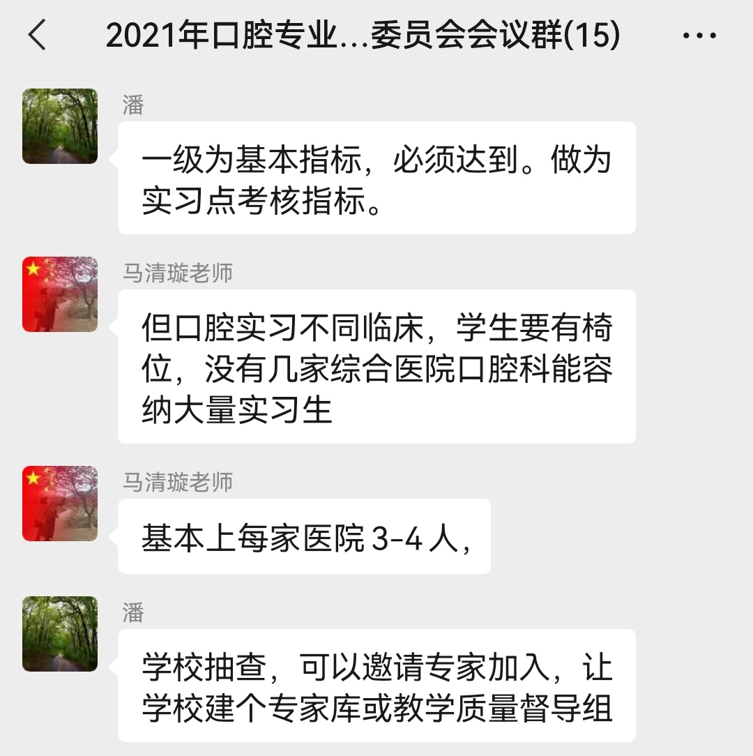 為進(jìn)一步加強(qiáng)口腔醫(yī)學(xué)專業(yè)建設(shè),提升口腔醫(yī)學(xué)專業(yè)人才培養(yǎng)質(zhì)量,9月30日,2021年醫(yī)學(xué)系口腔醫(yī)學(xué)專業(yè)指導(dǎo)委員會(huì)召開例會(huì),會(huì)議采用線上微信群聊的方式開展。