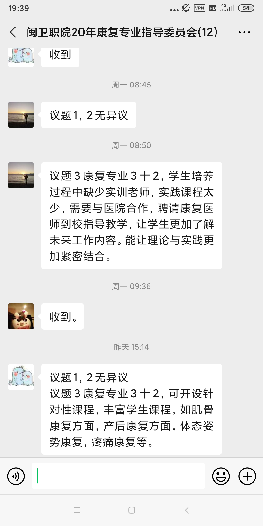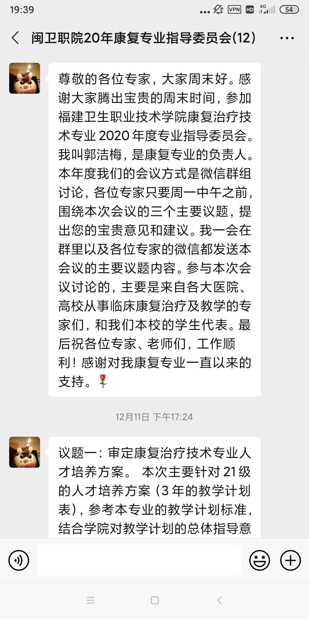 2020年醫(yī)學(xué)系康復(fù)治療技術(shù)專(zhuān)業(yè)指導(dǎo)委員會(huì)例會(huì)于12月11日召開(kāi),會(huì)議采用線(xiàn)上微信群聊的方式開(kāi)展議程。
