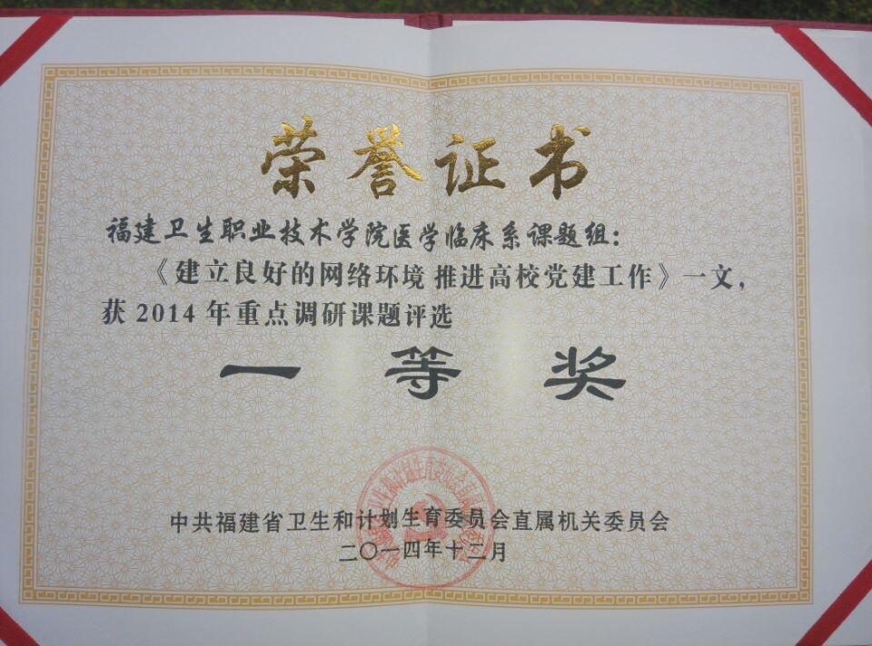 在2014年中共福建省衛(wèi)生和計劃生育委員會直屬機關(guān)委員會組織的重點調(diào)研課題評選活動中,我系邱滾忠書記指導(dǎo)的課題《建立良好的網(wǎng)絡(luò)環(huán)境 推進高校黨建工作》榮獲一等獎。