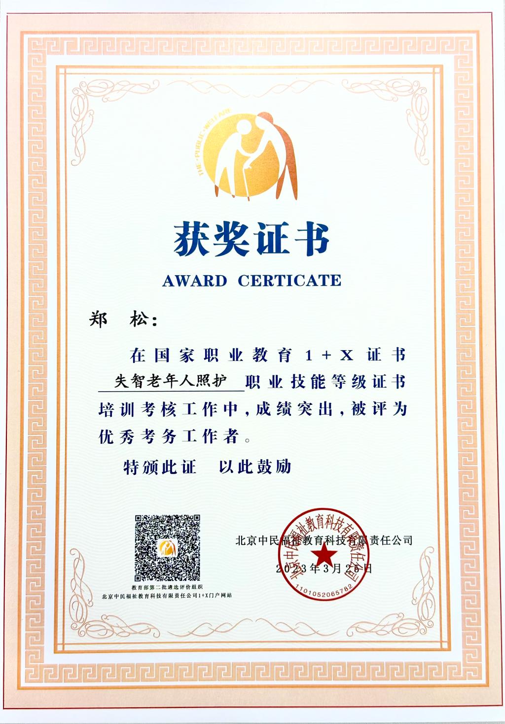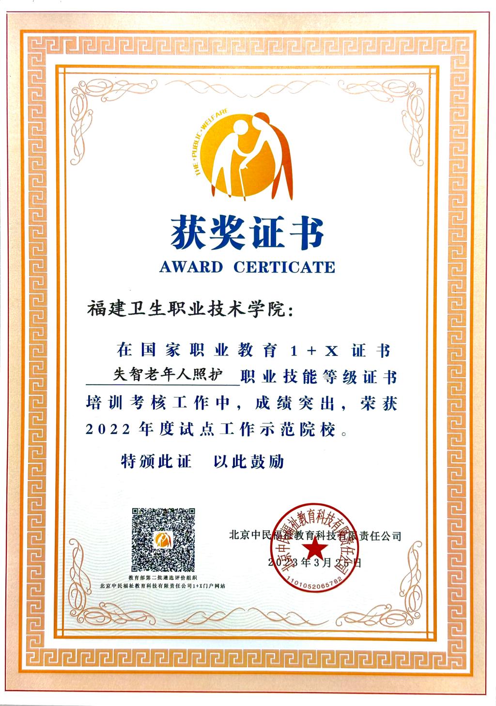 3月25日,在北京召開全國(guó)社會(huì)福祉領(lǐng)域1+X證書工作總結(jié)表彰暨2023年工作動(dòng)員會(huì),來(lái)自全國(guó)60余所院校、15個(gè)行業(yè)企業(yè)共200余人參加會(huì)議。我校被授予國(guó)家職業(yè)教育1+X證書《失智老年人照護(hù)》職業(yè)技能等級(jí)證書培訓(xùn)考核工作“2022年度試點(diǎn)工作示范院?!睒s譽(yù)稱號(hào),醫(yī)學(xué)院康復(fù)治療技術(shù)專業(yè)老師鄭松獲”優(yōu)秀考務(wù)工作者“、沈書泓獲”優(yōu)秀師資“榮譽(yù)稱號(hào)。