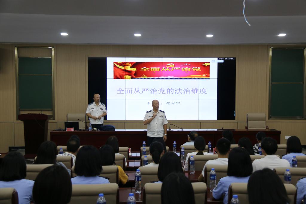 法律系吳文平書記熱烈歡迎我系黨總支一行的到來,隨后雙方在警察學(xué)院階梯教室共同聆聽法律系張光宇教授講授的《全面從嚴(yán)治黨下的法治維度》。張教授從深刻理解“四個全面”的重要內(nèi)涵出發(fā),全面從嚴(yán)治黨挽救了我們這個黨,挽救了我們這個軍隊(duì)。深入理解“依法全面從嚴(yán)治黨”的基本邏輯,必須明晰其概念內(nèi)涵,分析其基本矛盾關(guān)系,實(shí)現(xiàn)黨規(guī)與法規(guī)一體建設(shè),依法與從嚴(yán)相輔相成,治國與治黨同步推進(jìn),探求依法全面從嚴(yán)治黨的實(shí)現(xiàn)路徑,逐步建立與完善黨內(nèi)法治體系。