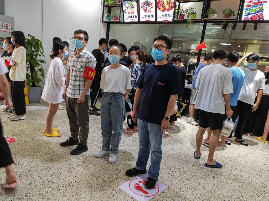 防疫期間,對學生的管理不僅要“嚴管”,還滲透在無微不至的關(guān)愛和服務中。為配合學院各項疫情防控工作,醫(yī)學系兩個黨支部輔導員積極投入到各項服務工作中,在核酸檢測現(xiàn)場,做好秩序維護、學生防暑工作。在食堂,同樣是這群身影開展防疫引導、為學生提供服務。