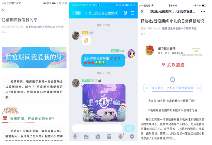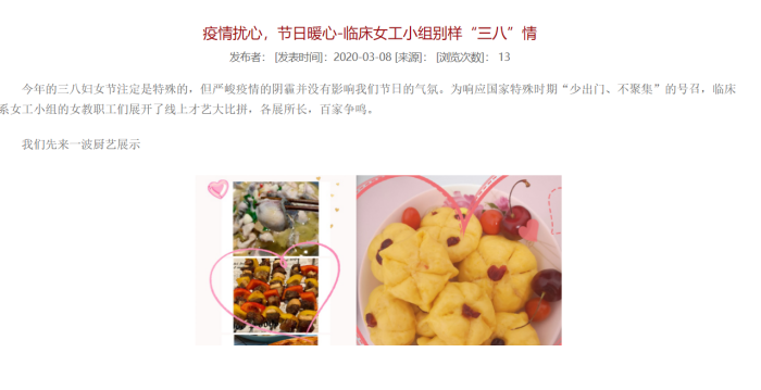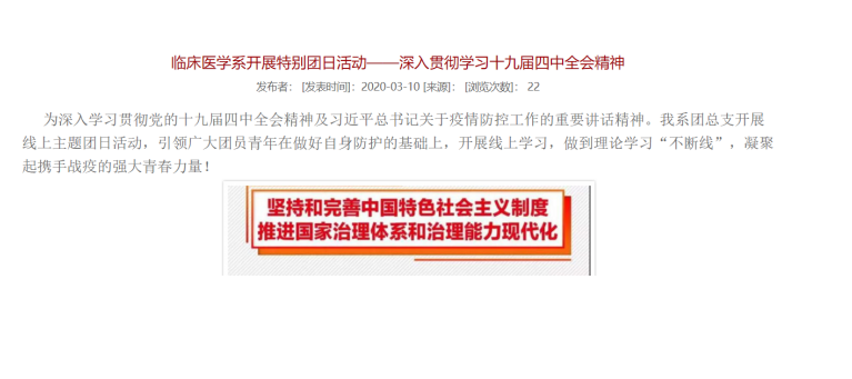 一、宣傳教育組:1.組織各支部黨員加強(qiáng)理論學(xué)習(xí),深入貫徹落實習(xí)近平總書記重要講話精神,并對相關(guān)學(xué)習(xí)情況進(jìn)行及時掛網(wǎng);2.對青年學(xué)生團(tuán)員學(xué)習(xí)黨的十九屆四中全會精神的情況進(jìn)行宣傳報道;3.“全國大學(xué)生同上一堂疫情防控思政大課”;4.對系部女職工開展別樣的“宅家”慶祝活動進(jìn)行宣傳報道;5. 通過QQ群、微信群、團(tuán)學(xué)公眾號等向師生宣傳防疫知識等。