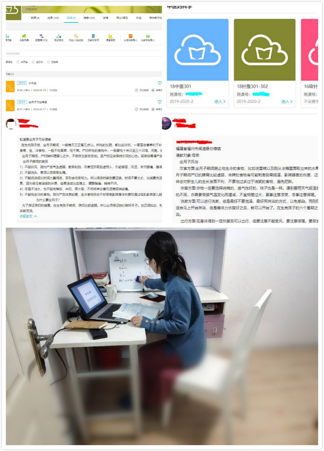為了保證直播課的順利開展,課前老師通過與其他老師的多次探討、多個平臺的反復(fù)試驗,最終選擇了騰訊課堂+藍墨云班課兩個平臺開展教學(xué)。因情況突發(fā),學(xué)生們沒有教材,便提前設(shè)計好授課ppt、找到配套或近似的電子教材、案例、視頻等分享在平臺上供學(xué)生預(yù)習(xí)。為了讓學(xué)生在屏幕前也能緊緊跟著老師的上課節(jié)奏,直播課程中時常切換分享ppt和視頻模式,并通過在線提問的方式及時了解學(xué)生對知識的情況,學(xué)生們在屏幕后也更能如實反饋他們的真實想法,總體教學(xué)效果良好。在課后,教師還在平臺上發(fā)布了作業(yè),既有課上的知識點考查,也有課程相關(guān)的開放性作業(yè)。本門課程具有較強的專業(yè)性,又與我們的生活息息相關(guān),應(yīng)利用學(xué)生在家的良好契機,增強親子溝通,讓學(xué)生在學(xué)習(xí)與實踐中了解婦女、尊重婦女,并能為解決婦女之病痛,提高婦女之幸福而作出一些探索和努力。對于授課對象中意不在婦科方向者,也教育他們能廣學(xué)多思,使得責(zé)任與機會降臨時,能不忘初心,勇敢地站出來做時代的擔(dān)當(dāng)者。