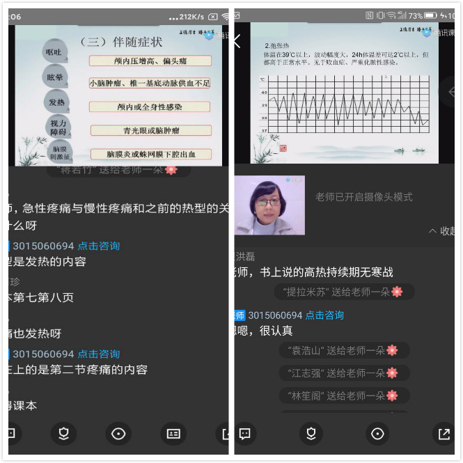 教研室的金建文老師本學(xué)期授課的課程是《診斷學(xué)》,這是一門重要的專業(yè)基礎(chǔ)課程,如何確保學(xué)生在網(wǎng)絡(luò)授課期間,能夠跟在校內(nèi)教室中一樣的學(xué)習(xí)效果呢,金老師一直在思考這個問題,畢竟網(wǎng)絡(luò)授課是以前未曾開展的,用什么平臺可以保障順利上課?用怎樣的方式跟學(xué)生進行更好的溝通?考慮到同學(xué)們手頭沒有教材,為了不影響學(xué)習(xí),金老師在課前把教材進行拍照,提前發(fā)給同學(xué)們進行預(yù)習(xí);在開始授課之前,金老師心中一直忐忑不安,擔(dān)心無法很好的開展網(wǎng)絡(luò)授課,影響教學(xué)效果,因此,提前很久就開始研究各種教學(xué)軟件的優(yōu)劣;最后,利用騰訊課堂錄播+直播的網(wǎng)絡(luò)教學(xué)形式,順利的開展了第一次的網(wǎng)絡(luò)授課,在授課過程中,不僅課件、視頻播放順暢,還能夠利用軟件跟學(xué)生開展多種形式的溝通互動,在上課過程中,同學(xué)們對于這種全新的教學(xué)方式也都非常感興趣,課堂氣氛非?;钴S,通過平臺,跟老師積極的互動、交流,圓滿的進行了教學(xué)內(nèi)容的學(xué)習(xí);課后,為了幫助同學(xué)們更好的掌握學(xué)習(xí)內(nèi)容,金老師又利用云班課軟件進行了多種形式的課外輔導(dǎo),發(fā)布小測、授課PPT等內(nèi)容,同學(xué)們也都認真的按照老師的要求進行了課外的復(fù)習(xí)小測,取得了很好的學(xué)習(xí)效果。