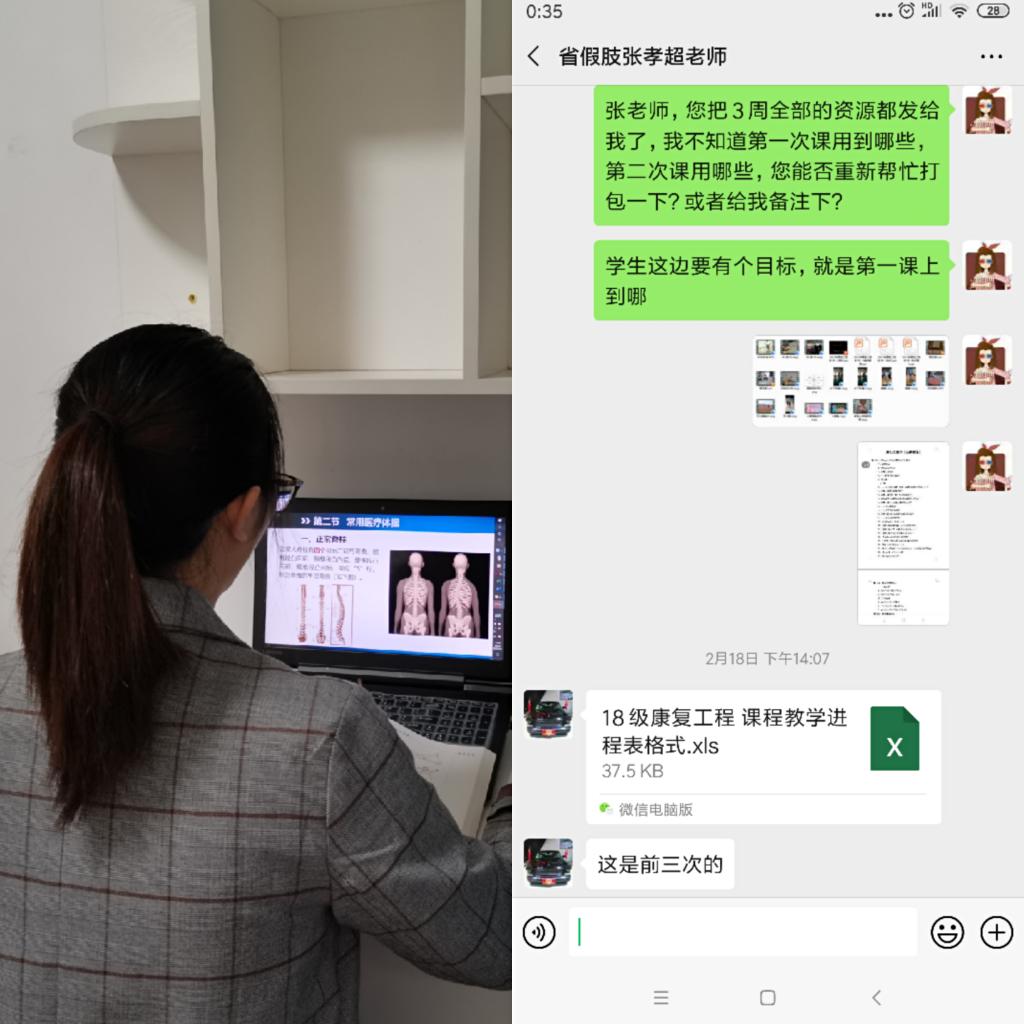 在教學(xué)之余,作為康復(fù)專業(yè)多門課程的教輔人員,保證外聘教師正常有序地完成線上授課是她的日常工作。從授課計劃的制定,到教學(xué)資源的準(zhǔn)備,從平臺的挑選、學(xué)習(xí)使用,到最后線上授課的實施,用她的話來說,可比自己上課累多了,但為了疫情當(dāng)前“停課不停教、停課不停學(xué)、教學(xué)不縮水”,辛苦都是值得的。