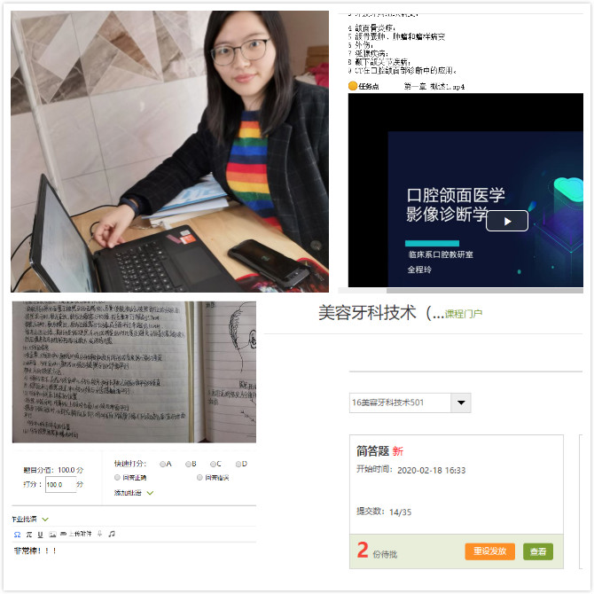 為了順利開展教學(xué)工作,全老師提前自學(xué)了騰訊課堂和學(xué)習(xí)通軟件。在學(xué)習(xí)通平臺上設(shè)置課程框架和教學(xué)環(huán)節(jié),設(shè)計課程PPT、題庫,錄制并上傳視頻、案例材料等相關(guān)學(xué)習(xí)資料,提前發(fā)布課程電子教材,布置課前預(yù)習(xí),讓學(xué)生及時獲取本節(jié)課的課堂安排和教學(xué)任務(wù),順利完成《口腔頜面影像學(xué)》、《美容牙科技術(shù)》等考查課的教學(xué)工作。采用”QQ直播+學(xué)習(xí)通”進行《口腔內(nèi)科學(xué)》線上教學(xué),實現(xiàn)“線下學(xué)生自學(xué)”和“線上師生互動”教學(xué)模式的互補優(yōu)勢。 為了調(diào)動學(xué)生的學(xué)習(xí)積極性,及時掌握學(xué)生的學(xué)習(xí)狀態(tài),全老師還摸索出一些小技巧:如組建輔助授課的學(xué)習(xí)通群,布置在線測試,跟蹤同學(xué)們的記錄并及時提出表揚和提醒,通過近兩周的運行,由于課程資源豐富、環(huán)節(jié)設(shè)計合理、授課手段多樣,全老師的線上課程平臺反饋的學(xué)生兩周時間學(xué)習(xí)點擊率已經(jīng)達三千多,雖然線上授課比平時上課準(zhǔn)備工作還要累,但是看到同學(xué)們能夠克服疫情影響,通過網(wǎng)絡(luò)開展學(xué)習(xí)、接受知識,同時自己在摸索中也提升了信息化教學(xué)水平, 她覺得這些付出是值得的。